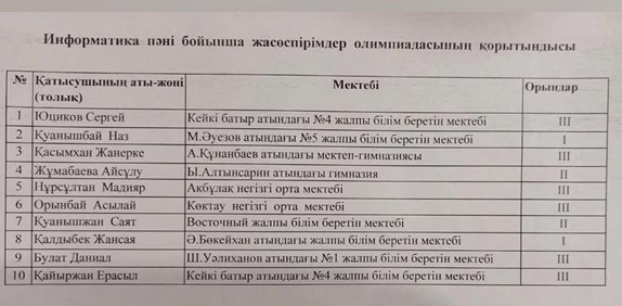 Ағымдағы жылдың 24 қаңтарында информатика пәні бойынша қалалық жасөспірімдер олимпиадасы өтті. Олимпиадаға 18 мектептен 57 оқушы қатысты. Олимпиада қорытындысы бойынша 10 жүлделі орын белгілі болды. Біздің мектеп-гимназиямыздың 5 сынып оқушысы Қасымхан Жанерке ІІІ орынға ие болды. Жетекшісі Жақсылық З.Б. Жеңістеріңіз құтты болсын!