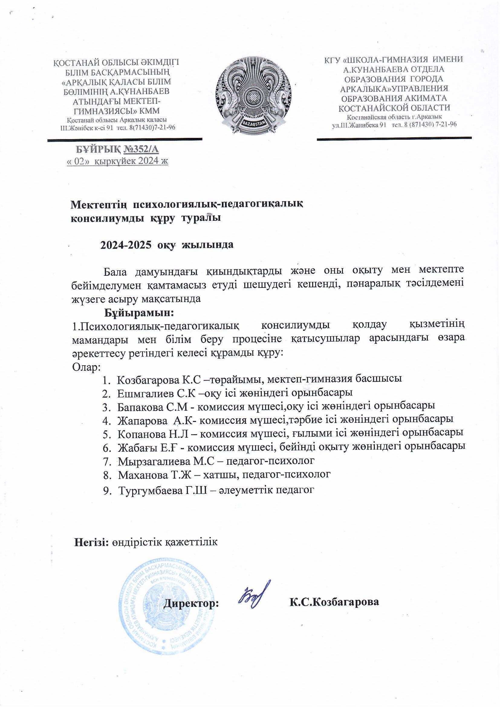 - Білім беру ұйымында Консилиумды құру туралы бұйрық (1 Қосымша).