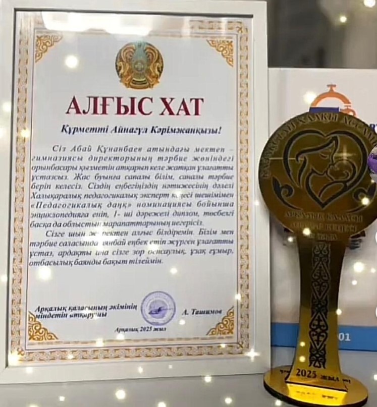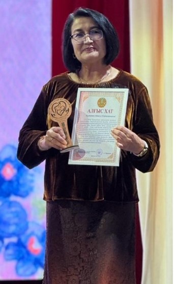 - Білім беру саласындағытабыстыеңбегі, жоғары кәсіби шеберлігі мен құзыреттілігі үшін Қостанай облысы білім басқармасының Құрмет грамотасы иегері
