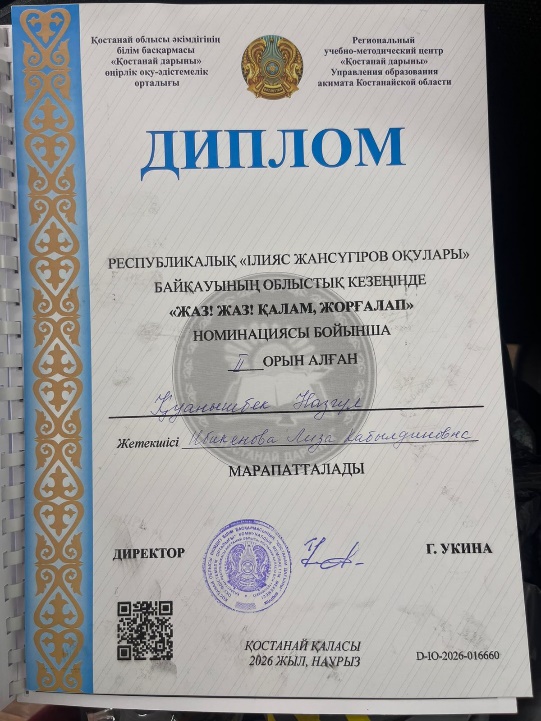 04.03.2026 күні Қостанай қаласында Республикалық "Ілияс Жансүгіров оқулары" байқауының облыстық кезеңі өтті. Байқауға облысқа қарасты ауыл және мектеп оқушылары қатысты. Байқау қорытындысы бойынша мектеп-гимназиямыздың 11 "Б" сыныбынан қатысқан Қуанышбек Назгүл "ЖАЗ! ЖАЗ! ҚАЛАМ, ЖОРҒАЛАП" номинациясы бойынша жүлделі ІІ орынға ие болды. Жетекшісі Ибикенова Л.К. Жеңістеріңіз құтты болсын!
